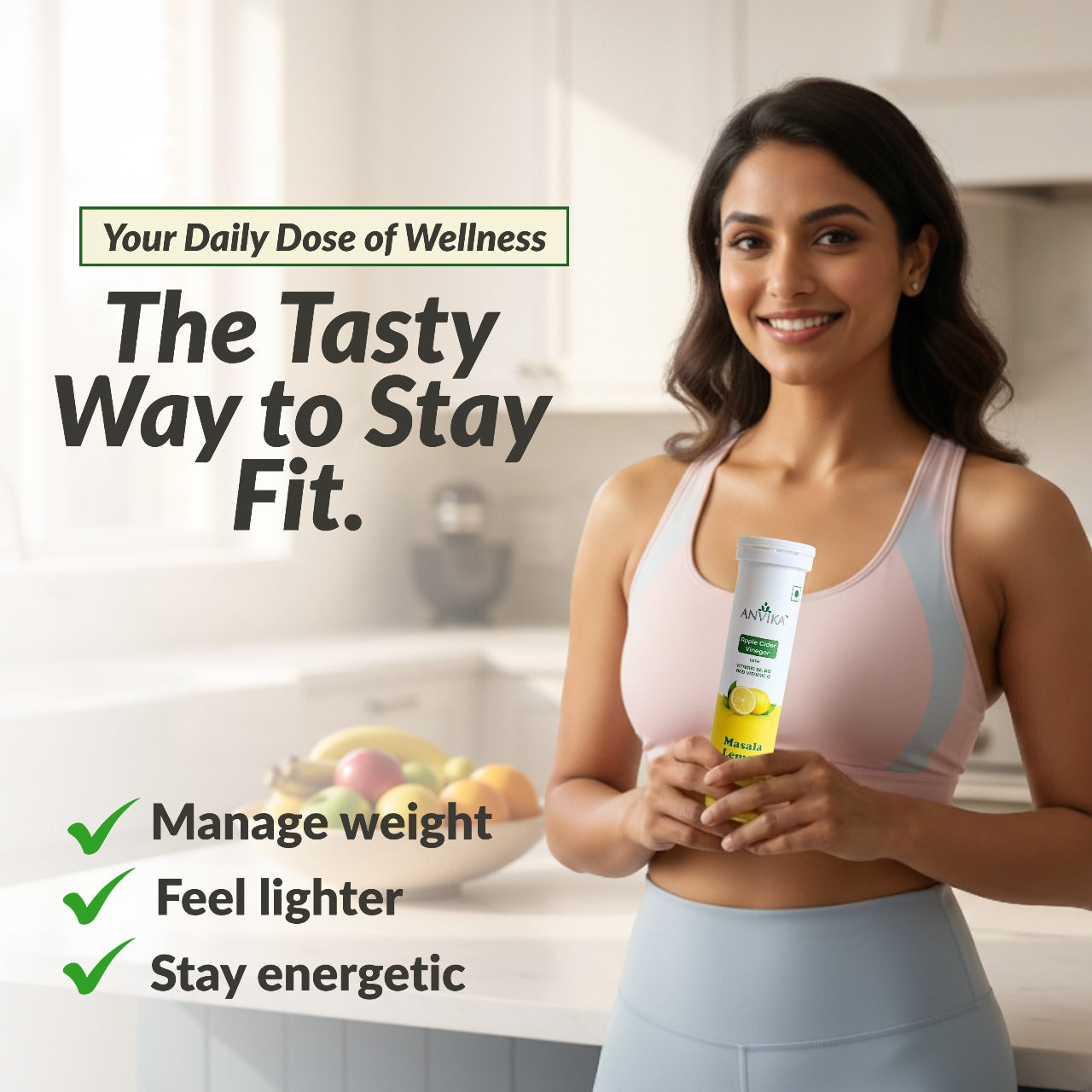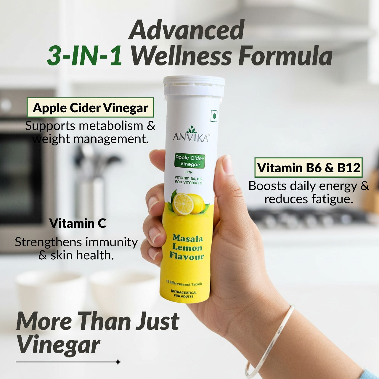 Anvika Apple Cider Vinegar Effervescent Tablets – Masala Lemon Flavour | With Vitamin C, B6 & B12 | 15 Effervescent Tablets for Digestion, Detox & Metabolism